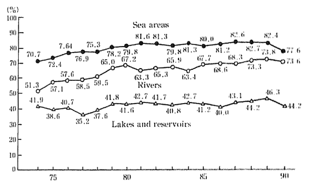 As a result of the increasing diffusion of flush toilets among the population, the volume of raw sewage has been falling in recent years. In 1989, there was a total of 36.87 billion liters of raw sewage, compared to 37.51 billion liters in 1988. On the other hand, the volume of sewage sludge and digester chamber sludge is increasing (Figure 1-1-30).