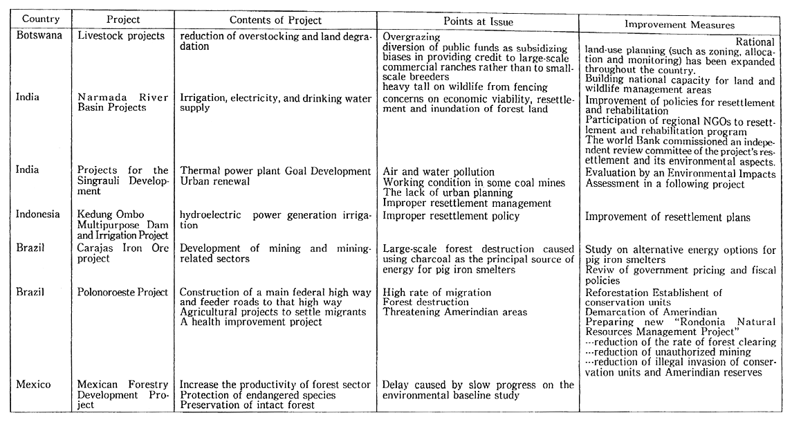 Development aid projects, particularly those on economic infras-tructures become large in scale, bring about significant impacts on the environment in some cases. The World Bank, the world's largest inter-national development assistance agency, has released a report on the environment policy every year since 1990. In the reports, it assesses the impacts on the environment by the projects it has implemented and the measures to cope with them. The reports introduce projects which have some improvement measures, faced with such problems as involuntary resettlement of the communities in the construction of dams, pollution in the development of mining and manufacturing industries and defores-tation. (Table 3-2-21).