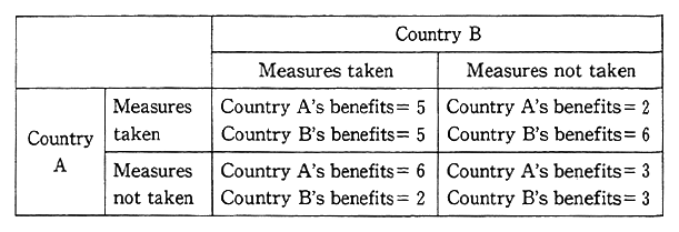 Second, environmental measures benefit not only persons who are taking measures, but those who are not doing so as well. There is a danger that this will lead to the appearance of free riders who will partake only of benefits without taking any measures. A case in point is the use of. private autos, enjoying the benefits of the atmosphere, while attempts are made to reduce nitrogen oxide emissions by avoiding their unnecessary use under strict self-discipline. While businesses compete with one another in their corporate activities, their profits will go down if they spend more money than other businesses. Here, there is a danger that they are less willing to take measures. The game theory is an attempt to analyze what actions a number of persons will take and what sorts of results on condition that their own gains are determined by each participants' action. Here, higher gains may be secured if the participants cooperate with one another less but secure gains if they don't cooperate. This phenomenon is known as a "social dilemma." Table 4-1-1 numerically illustrates the "social dilemma" for a moment that the world is made up by only two countries. In this table, have Nation A and Nation B decide which they are, "to take measures" or "not to take measures," and the gain of either nation will be deter- mined, depending on its and the other nation's option. If either nation does not take measures of its own, it will have to bear the cost; if both nations do not take measures, they will have to sustain the loss which is caused by a failure to do so. Here, if both Nation A and Nation B take measures, the gain of either nation will be 5; if either nation takes measures but the other does not do so, its gain will go down to 2. Therefore, if an attempt is made to maximize assured gains in a situation where the other country's cooperation cannot be expected, the gain of either nation will be 3.