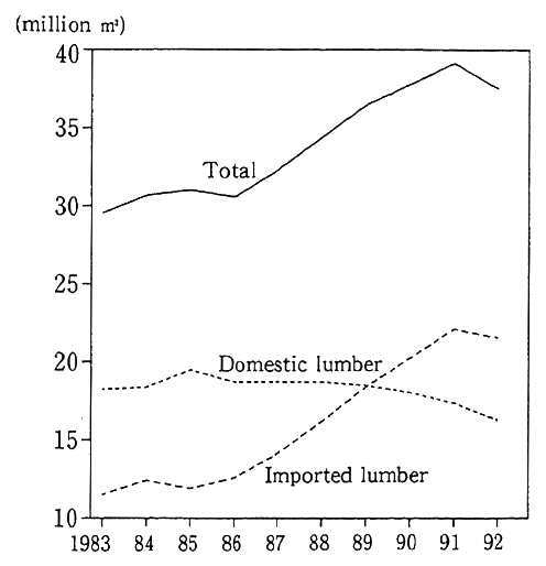 The share of imported lumber used for paper production (known as the pulp material) stood at 57% (in 1992), and most of the exporters were developed countries. Low-quality lumber unsuitable for lumbering and residual lumber are primarily used. When it is taken into account that about 40% of Japan's lumber consumption is set aside for paper production, it is desirable to shift to forests managed sustainably instead of recklessly increasing the consumption. This approach is also important for the sound development of regions which are dependent on forest resources.