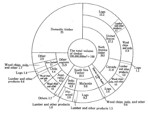 Next, we will examine Japan's role in the world timber market, focusing on the current supplies to Japan. When converted into logs, the volume of timber material supplied to Japan is 108,490,000 m3, quarters of which is imported (Figure 2-19).