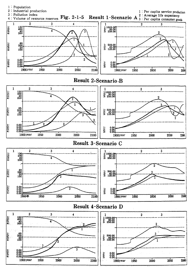 In scenario A, where no environmental investments have been made, industrial production grows rapidly through the first half of the 21st century. Nevertheless, this leads to a depletion of resources, and industrial production falls rapidly after reaching its peak. Moreover, the pollution index rises sharply from around the middle of the 21st century. Per capita service production and consumer goods fall sharply from around the middle of the 21st century and decrease to mid-2Oth century levels by 2100. In scenario B, growth in industrial production is slightly lower than in scenario A as are the peak figures for industrial production. Nonetheless, because of environmental investments, the rate of decrease in resource reserves and the highest figures for the pollution index in scenario B are significantly lower than in scenario A. As a result, the eventual decline in industrial production in scenario B is significantly less than it is in scenario A. This also holds for per capita service production and consumer goods. Although the growth rate for per capita service production and consumer goods decreases in scenario B, the eventual decline is much less severe than that in scenario A. However, if there is an over-allocation of capital for environmental investments, although resource reserves will be abundant and the pollution index figures will be low, industrial production will trend downward throughout the 21st century. Moreover, per capita consumer goods and service production will also decrease precipitously (scenario C). Finally, in scenario D, where the percentage of environmental investments to industrial investments is adjusted every five years to ensure that industrial production does not decline, it is possible for industrial production to continue to rise for the approximately 100-year period to 2100 (Figure 2-1-6). Also, because population will increase in the same manner as industrial production, it is possible to stabilize per capita consumer goods and service production at early 21st century levels (scenario D).