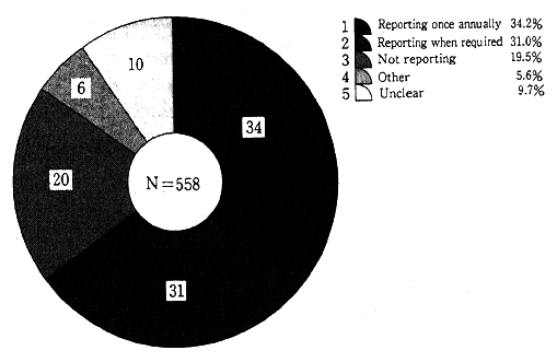 The trend toward implementing environmental management systems is also growing within Japan's industrial sector. Government policies outlined in MITI's Voluntary Plan on the Environment, adopted in October 1991, and the Environment Agency's Environment-Friendly Corporate Action Guidelines, issued in February 1993, are proving effective in encouraging companies to undertake independent environment-related initiatives. A survey on environment-friendly business practices, conducted by the Environment Agency in fiscal 1993, revealed the extent to which companies were introducing environmentrelated guidelines and goals and periodically monitoring their own business practices. Of the companies that responded to the survey questionnaire, 35.9% were implementing some form of environmental surveillance or monitoring, with 27.8% already undertaking these initiatives and 8.1% planning to do so within the fiscal year (Figure 2-3-2). Additionally, 65.2% of responding companies stated that personnel responsible for overseeing business practices that impacted the environment reported to an authoritative body, and 34.2% of these companies made the periodic compilation of such reports mandatory more than once per year (Figure 2-3-3).