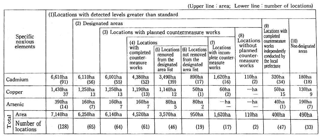 As of November 30, 1994, within all areas where concentrations in excess of environmental quality standards were detected, 6,250 hectares (65 sites) had been designated for countermeasures and plans for such countermeasures were mapped out for 6,140 hectares (64 sites) of the above. Through the special enterprises established to improve soil quality for the purpose of preventing public hazards (funded by the national fund), works of corrective actions such as soil removal, soil dressing and changes of water sources have been completed for 4,520 hectares. This will bring the improved area to a total of 4,920 hectares including works done by individual prefectures, and 68.9% of the correc-tive works for areas with detection of values exceeding the standard value has been completed (Table 9-3-1).