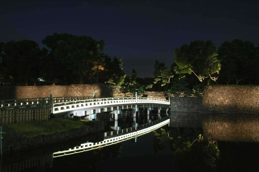 夜間のライトアップによって、馬に乗った名将の楠木正成像、和田倉橋の優雅なアーチ、桜田門の風格ある外観、石垣、城壁などの皇居外苑の一部が、ほんのりとした光で照らされます。