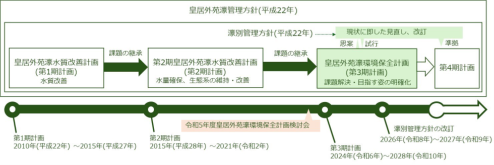 さらに環境省では皇居外苑濠の適切な管理を行うため、2010年(平成22年)3月に皇居外苑濠管理方針及び水質改善の実施計画である皇居外苑濠水質改善計画(第1期計画)を策定、2016年(平成28年)3月には実施計画を皇居外苑濠水環境改善計画(第2期計画)に改定し、アオコの大量発生の防止など、濠環境の保全に取り組んできました。