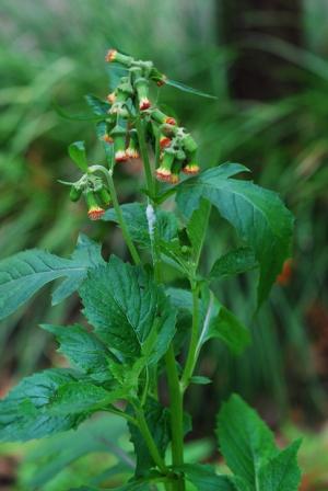 雌株の雌花の花序は下に垂れ下がり花を咲かせる(写真下)