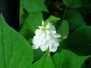 以前「ドクダミ」を紹介しましたが、こちらは八重咲のドクダミです。花びらに見える苞(つぼみを包んでいた葉の部分)が八重になっています。本体の花は黄色い部分で、花びらはありません。