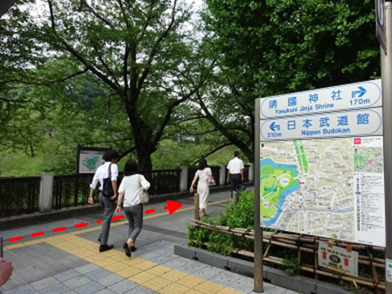 エレベーター等のバリアフリー設備が整った地下鉄出入口から北の丸公園(田安門口)までは、約380m、ゆっくり歩いて約7分です。最寄りの出入口からよりも少し遠回りになりますが、九段坂(靖国通り)の沿道では、皇居のお濠の一つである牛ヶ渕を望む眺望や深々と茂る靖国神社の杜等、九段坂ならではのみどり豊かな景観もご覧いただけます。