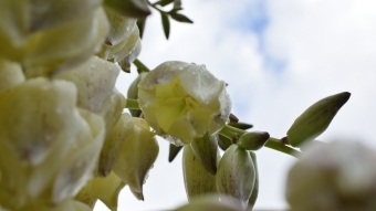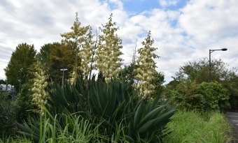 キミガヨ(君が代)という名は、学名にある「glorisa」を和訳したものだそうです。北米原産のアツバキミガヨランは、春と秋、年に2回開花します。また、アツバキミガヨランの葉は硬く、長さが60~80㎝もあり、白い大きな花が終わって残った茎は枯れ枝のようで、他の植物とはまた違った特長がみられます。
