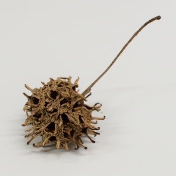 ウニのような形をしているのはモミジバフウの実です。大きさは直径4㎝ほどです。見上げた木には、まだ実が残っています。