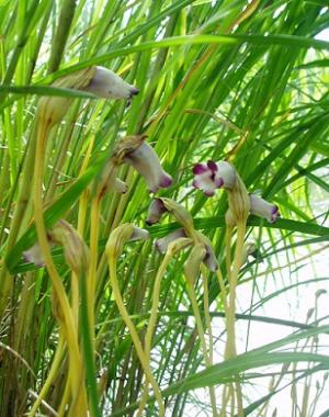 ナンバンギセルは主にススキの根に寄生する寄生植物。自らの力では生長できないので、他の植物の根に寄生して、そこから養分を取りながら生育します。ススキの葉をどかしてご覧下さい。