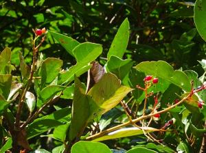 キョウチクトウのすぐ隣では、サンゴシトウが咲きはじめました。燃えるような真っ赤な色が特徴的。沖縄の県花である、「デイコ」の仲間としても知られています。