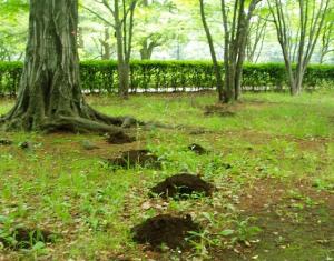 園内の樹林地等では、モグラの穴がたくさん見られます。巣である地下トンネルの修復や改修の際、残土を巣の外に排出した為にできたもので、これらは「モグラ塚」と呼ばれています。