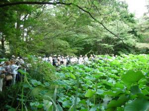 7月21日(海の日)午前、京都御苑自然教室“夏の御苑にふれよう”が開催されました。約160名の参加者は、トンボ池をスタート地点として、堺町御門東の樹林地から宗像神社周辺へとコースをとりました。