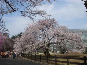 旧温室前のソメイヨシノ。この木は樹齢100年近く経っています。サクラの木の寿命は普通60年くらいと言われていますが、園内には樹齢約100年の桜が各所にあります。