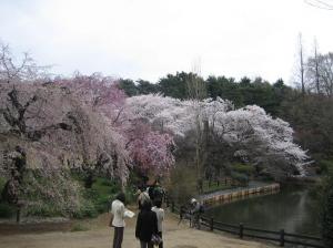 下の池付近。濃いピンク色の桜は「ヤエベニシダレ」です。