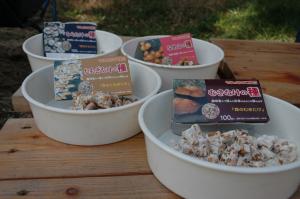 シイタケ、ナメコ、ヒラタケ、クリタケ、タモギタケの菌駒を用意しました。シイタケはクヌギの原木に、ナメコはサクラの原木に、他のキノコはスダジイの原木に接種しました。