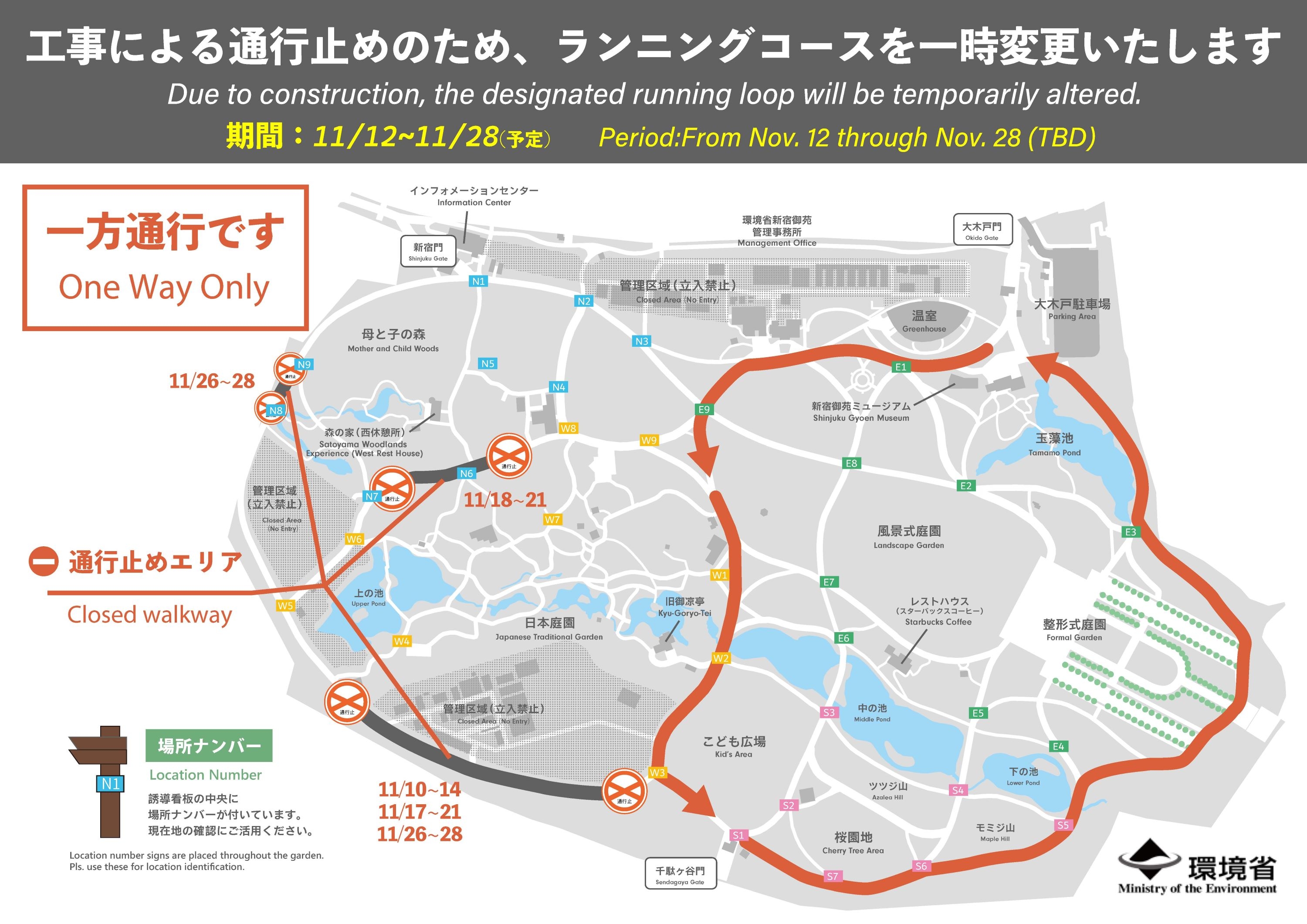 通行止めに伴い、園内ランニングコースは下記の一方通行のコースになります。