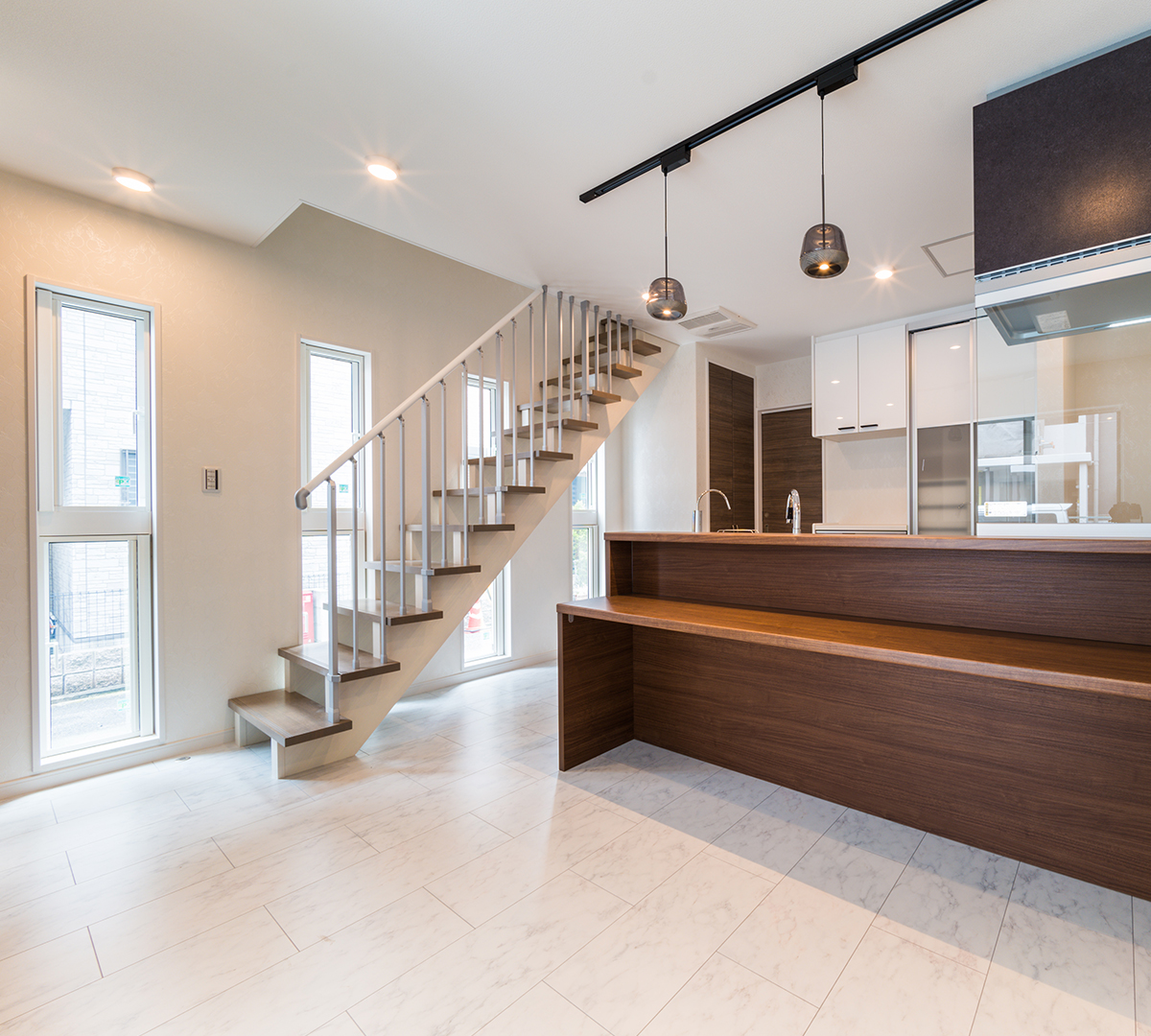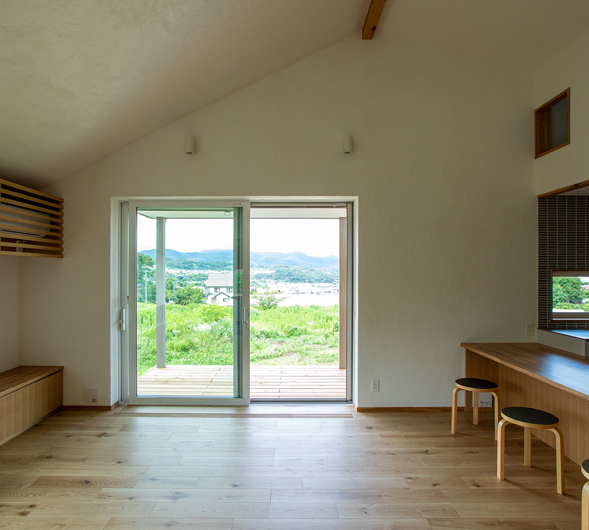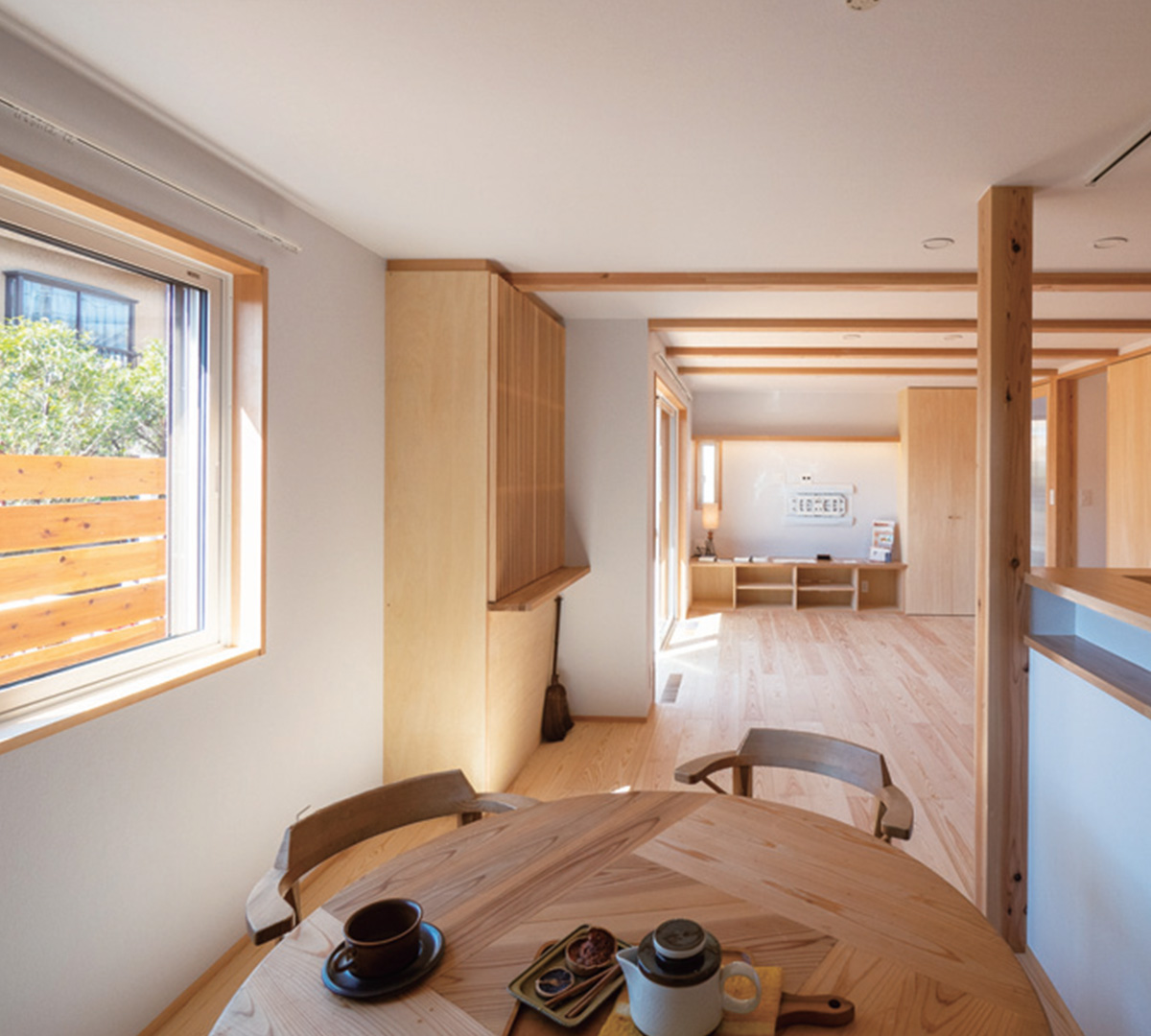 この木造の戸建は、基礎と壁、屋根に十分な断熱材を施し、窓も樹脂サッシとペアガラスにすることで高い断熱性を実現しています。 無垢の木を多用し、断熱性と相まって心地よく過ごせる空間に仕上げています。