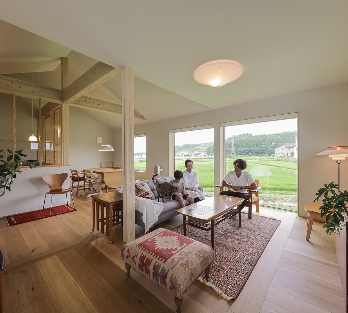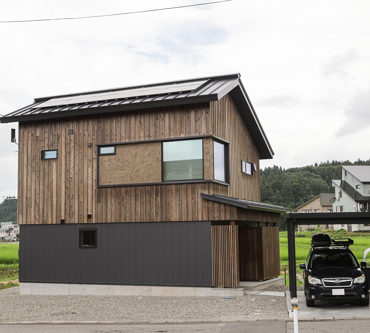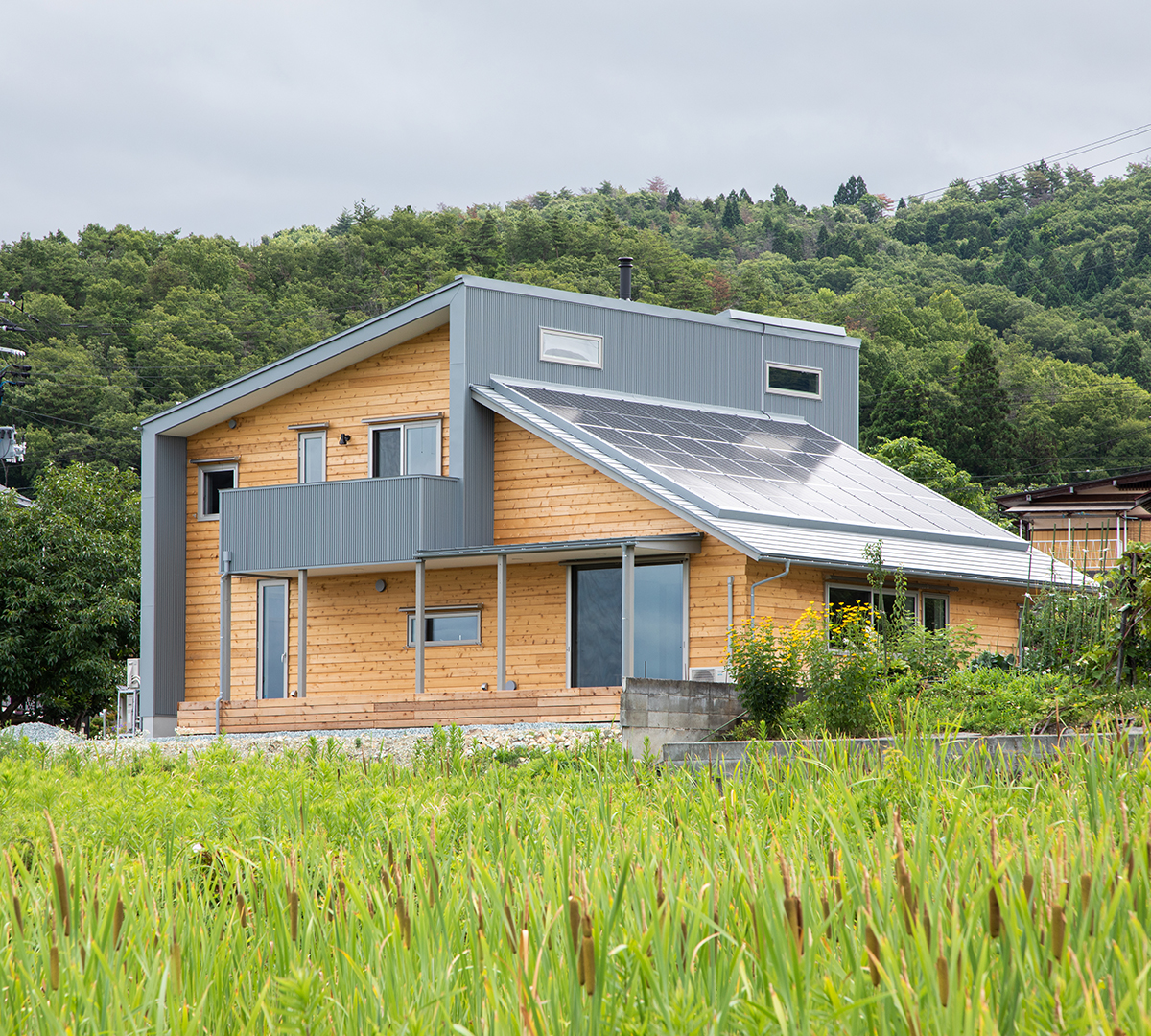 県内でも有数の豪雪地帯で山間部にあるこの家は、太陽光パネルの集光効率を上げるため屋根の勾配が急になっていて、自然に雪が流れるように設計されています。また、窓の設置にも工夫が凝らされており、家族が集まって長い時間を過ごすリビングルームには、外の景色を楽しめる大きな窓を取り付けつつ、高断熱なサッシを用いることにより断熱性能を高めています。一方で暑い日差しが差し込む西向きの窓には、日射熱の入りにくいガラスを採用しています。