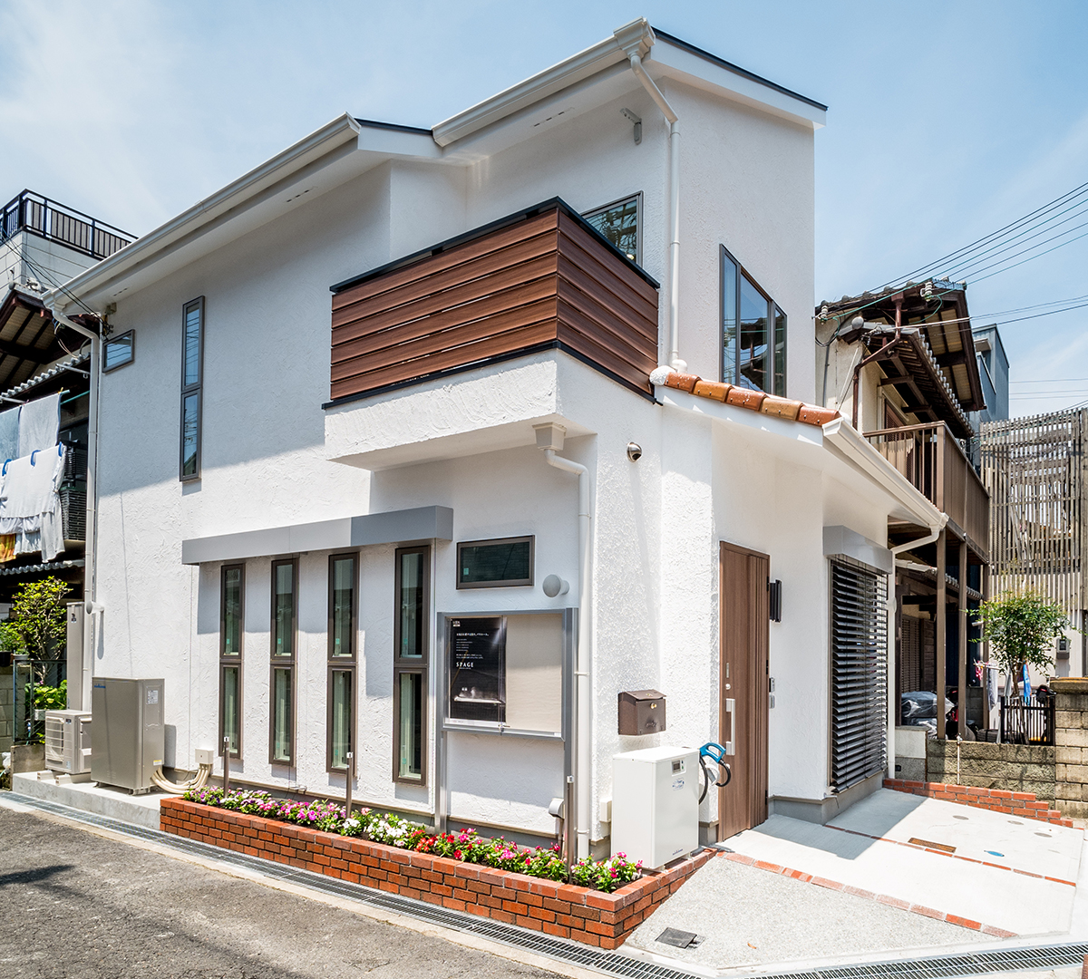 古い家がZEHに生まれ変わる事例もあります。大阪府にあるこの家は築40年の木造住宅をフルリノベーションによってZEHにしたものです。元々あった家の柱はそのままに、外壁と内壁の間にウレタンフォームの断熱材を吹き付けたほか、サッシのリフォームや内窓の設置などによっても断熱性能を高めました。また、太陽光発電設備と蓄電地、さらには電気自動車を蓄電池として利用する「V2H*5システム」も備えています。
