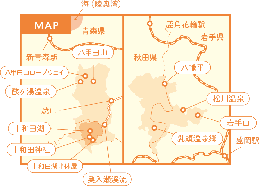 JR新青森駅 →[ JRバス東北(約1時間)]→ 八甲田ロープウェー →[ JRバス東北(約10分)]→ 酸ヶ湯(すかゆ)温泉 →[ JRバス東北(約1時間)]→ 焼山(奥入瀬渓流) →[ JRバス東北(約45分)]→ 十和田湖畔休屋