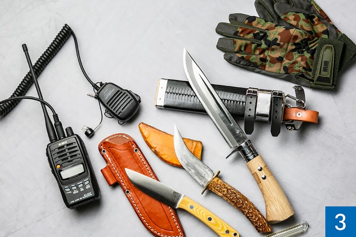 1_有我さん(左)と第一線で活躍する先輩ハンターの皆さん 2_猟犬の嗅覚で獲物を探して追い込み、ハンターが仕留める「巻狩り」 3_狩猟時の携帯必須アイテム。ナイフは用途によって使い分けている