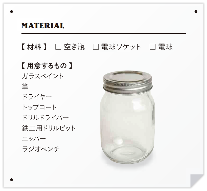 ジャムや調味料などの大きめの空き瓶を使って、間接照明にピッタリなインテリア照明を作ります。空き瓶は電球が入るサイズなら何でもOKですが、しっかりフタが閉まることを確認しましょう。また無色のガラス瓶で作ると、光を通してペイントした色がキレイに出ます。ライトを点けても熱くなりすぎないLED電球を使うのがオススメです。