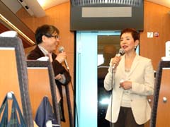 チーム・マイナス6%のチーム員企業である小田急電鉄(株)が主催した「エコ・ロマンスカー」で実施された「親子で学ぼう!春の温暖化防止スクール」に、斉藤環境大臣が参加しました。グリーン電力で運行されるロマンスカーの社内で、100名の親子に地球温暖化防止について楽しく学んでもらおうという企画です。ホームでの出発式の後、エコ・ロマンスカーが発車すると、まず鉄道ファンでもある斉藤大臣が車内放送で挨拶。気象予報士の森田正光氏による地球温暖化についてのトークショーや、気象予報士ユニット晴家(ハレルヤ)による雲の発生などを学ぶ気象実験室などが行われ、親子で楽しく地球温暖化について学んでいただきました。