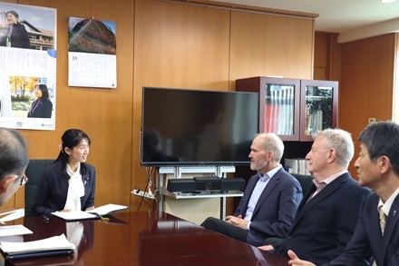 森下大臣政務官は、地球環境問題の解決に向けて顕著な貢献をした個人または組織に贈られる地球環境国際賞である、ブループラネット賞を受賞したロバート・B・ジャクソン教授、ジェレミー・レゲット博士による表敬訪問を受け、研究内容等について意見交換を行いました。