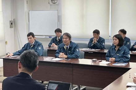 Minister Ishihara, State Minister Tsuji, and Parliamentary Vice-Minister Tomonoh visited a solar panel recycling facility in Ota City, Tokyo. They exchanged views on advanced recycling equipment, the "Hot Knife", which separates and recovers the glass and silicon cells of solar panels without crushing them.