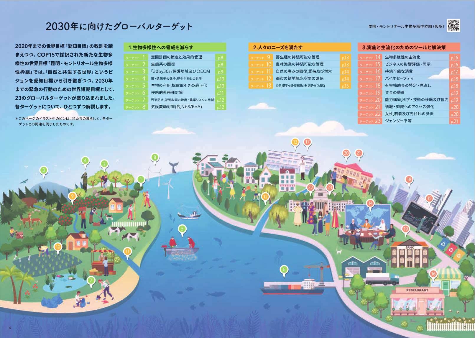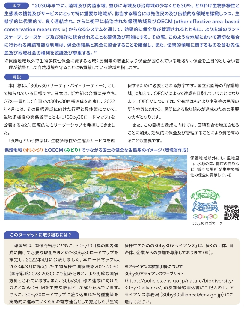 2020年までの世界目標「愛知目標」の教訓を踏まえつつ、COP15で採択された新たな生物多様性の世界目標「昆明・モントリオール生物多様性枠組」では、「自然と共生する世界」というビジョンを愛知目標から引き継ぎつつ、2030年までの緊急の行動のための世界短期目標として、23のグローバルターゲットが盛り込まれました。