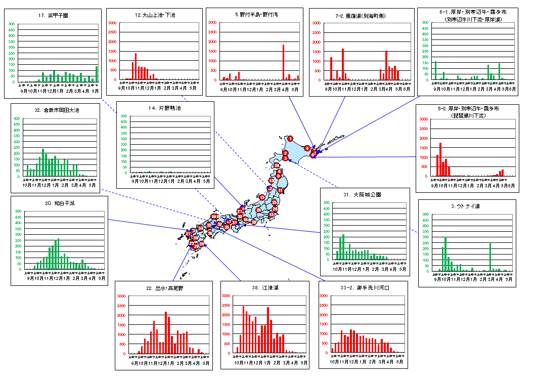 色の異なるグラフは縦軸(個体数)のスケールが異なっています。