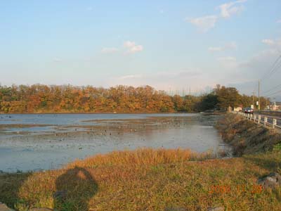 加戸の大堤は、水田への灌漑用水池として人工的に造られた周囲約1.3㎞、面積約9haの池で鳥獣保護区特別保護地区に指定されています。通称「鴨池」と呼ばれており、その名前の通り、冬期にはマガン、コガモ、ヒドリガモなどのカモ類が集まり、トモエガモも観察することができます。周辺は、国道や遊園地になっていますが、「ガンカモ科鳥類生息調査」によると毎年2,000~4,000のカモ類が確認されています。また、加戸の大堤の南に広がる坂井平野は片野の鴨池(石川県加賀市)に飛来するマガン、オオヒシクイの貴重な餌場となっています。 |