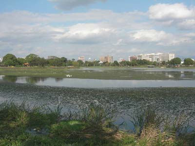 江津湖は熊本市東部に位置し、加勢川によって形成された河川膨張湖で、全体はヒョウタンのような形をしており、北側が上江津湖、南側が下江津湖と呼ばれています。全面積は約50haで、周辺は湧水が多く、熊本市動植物園なども隣接し、公園として整備されています。