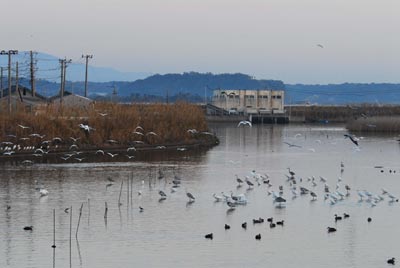 宮崎県のほぼ中央部を流れる一ツ瀬川の河口に位置する調整池です。水鳥の餌となる小魚が豊富であるのと池の中にある葦原が鳥たちの隠れ家にもなっていることから、サギ類をはじめ多くの鳥が集まってきます。特に冬季にはクロツラヘラサギやオオバン、カモ類が見られます。
