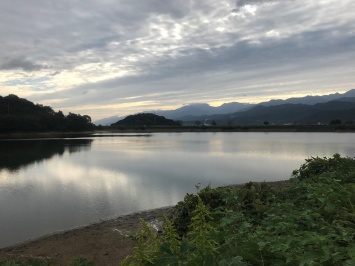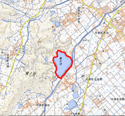 兼久池(別名,池之内池)は瀬戸内海に面した愛媛県西条市の山裾にあります。1791年に灌漑のために造られたため池で、貯水量は46万トンと西条市周辺では最も大きなため池です。周囲は駐車場や遊歩道が整備されており,石鎚山系の眺望もよく,春には桜や散策を楽しむ人が訪れます。