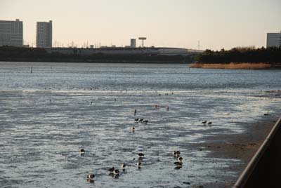 特徴 谷津干潟は、かつて周辺一体の干潟の一部であったものが、周辺の干潟が次々と埋め立てられる過程で残されたものです。干潟は、四方をコンクリートの護岸等に囲まれたプールのような環境で、東部と西部の水路で東京湾とつながっていて、潮の満ち引きもみられます。ここは、日本に飛来するシギ・チドリ類の約1割が観察されるなど、全国有数の渡り鳥の飛来地となっています。