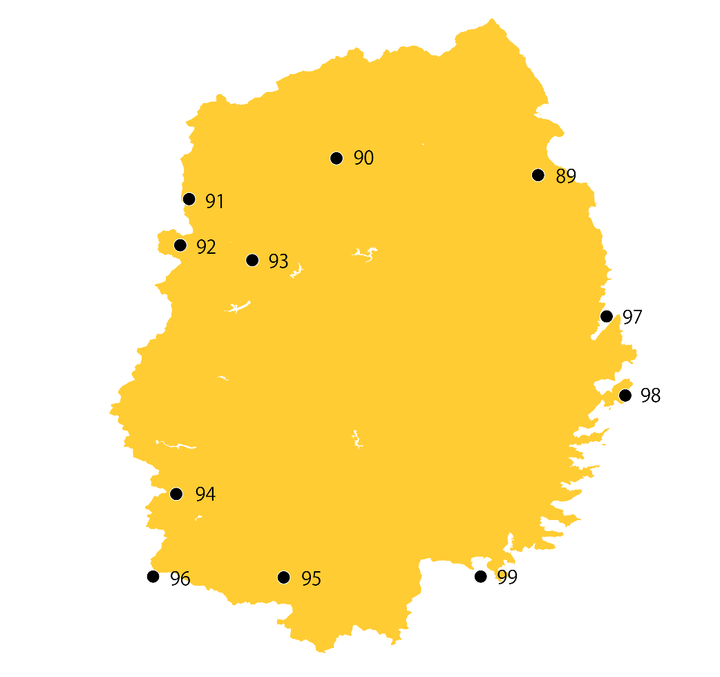 | 97 | 宮古市,下閉伊郡山田町,上閉伊郡大槌町,釜石市など | 三陸リアス海岸の湾奥沿岸 | さんりくりあすかいがんのわんおくえんがん |