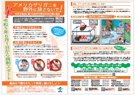 決して、飼育が困難になったからといって、アカミミガメやアメリカザリガニを野外の池や川に放さないでください。野外に放したり、逃がしてしまう行為(放出)は法律で禁止されています。このような違法行為を行った場合には、重い罰則・罰金が科されることがあります。