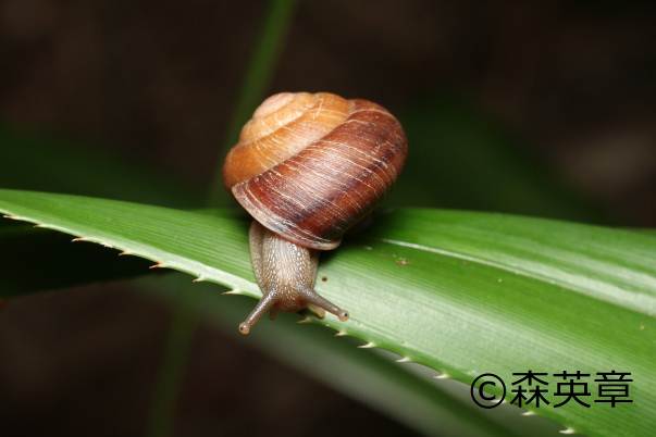 ①種の特徴:殻長13.0mm、殻径21.0mm程度で、偏平、やや薄質、螺層はわずかに膨れる。体層周縁は円い。殻色は淡黄褐色から濃褐色で、色帯をもたない。殻表はほぼ平滑。殻表の光沢は弱い。臍孔は広く開く。殻口は厚く肥厚・反転する。タコノキやオガサワラビロウが生育する林内の樹上から地上までを利用する半樹上性の種である。