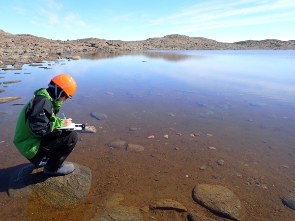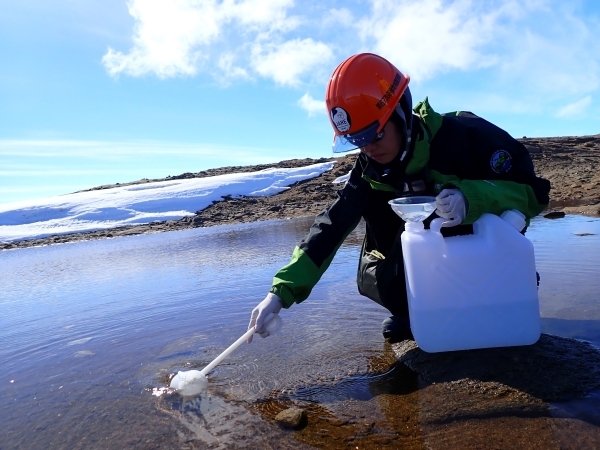 今回は、モニタリング調査のために、他の隊員にもご協力いただき、池の水と池周辺の土を採取し、周辺の状況を記録しました。採取地点は、人間活動の影響が少ない地点として、昭和基地近くの「たらちね池」、「かもめ池」と名付けられている池を選びました。今後、他の地点でも試料を採取し、日本に持ち帰って分析を行う予定です。