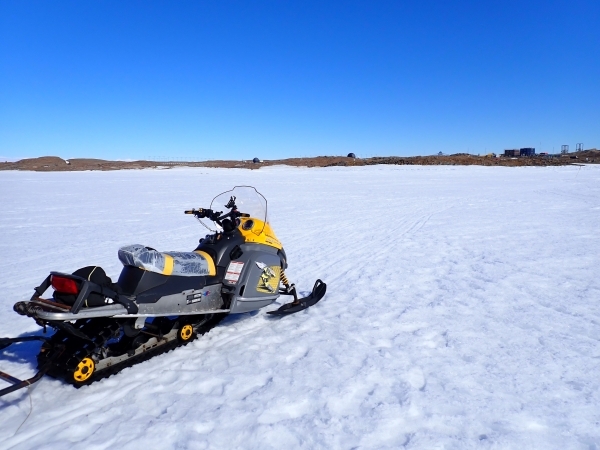 この調査地点は水深が32mある海の上なのですが、海に氷が張っているため、調査地点までスノーモビルに乗って向かうことができました。