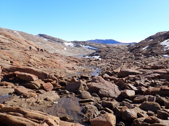 今回活動するスカルブスネスは、第14回でご紹介したように「露岩域(ろがんいき)」といわれるだけあって、調査地となる湖まで、大きな岩の上や、岩と岩の間をひたすら歩きます。