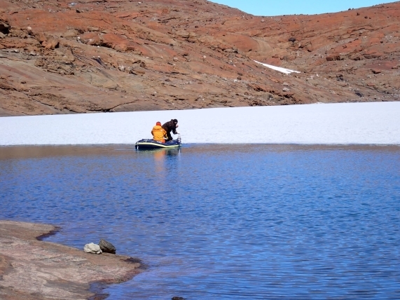 湖に到着した調査チームは、湖で生きる生き物を調べるため、早速、ボートで湖に繰り出しました。この湖の底にある堆積物をボートの上から採取し、そこにどのような生き物がいるか調べるのです。特にこの湖の堆積物は、古い時代から新しい時代まできれいに層が積み重なっていて、昔から現在までの生き物と環境の変遷(へんせん)を読み取ることができます。