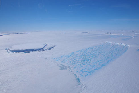 ヘリから見た南極の風景。パドルと呼ばれる海氷上の水たまりが見えます。![]()