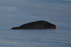 昭和基地周辺で最もよく見られるアザラシです。定着氷域に入ってからしばらくの間は見かけなかったのですが、ようやく昨夜見つけました。氷の上にアザラシがいるということは、近くに穴が開いており周りの氷が薄いことが考えられます。海氷上を走っている雪上車の運転手にとっては自分が海に落ちないために、見つけたら警戒を感じる生きものですが、砕氷を行う「しらせ」にとっては順調な航行を示唆する有り難い生きものと言えるかもしれません。