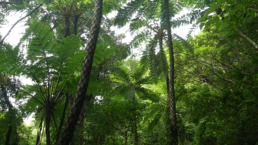 スダジイやイジュ、タブノキなどを主体とした奄美大島を代表する森林。照葉樹に覆われた林道沿いに木生シダのヒカゲヘゴや巨大な葉のクワズイモなどが見られ、亜熱帯の雰囲気が感じられます。