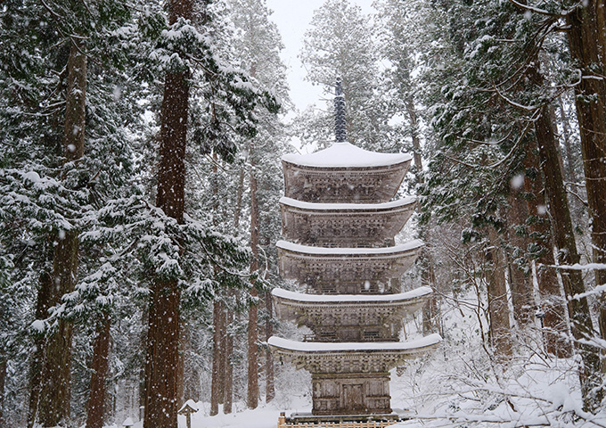 特別天然記念物、羽黒山の杉並木の中にひっそりと立つ国宝羽黒山五重塔は、平安期平将門の創建とされ、現在の塔は南北朝時代に再建されたと伝えられています。東北地方では最古の塔といわれ、昭和41年に国宝に指定されました。